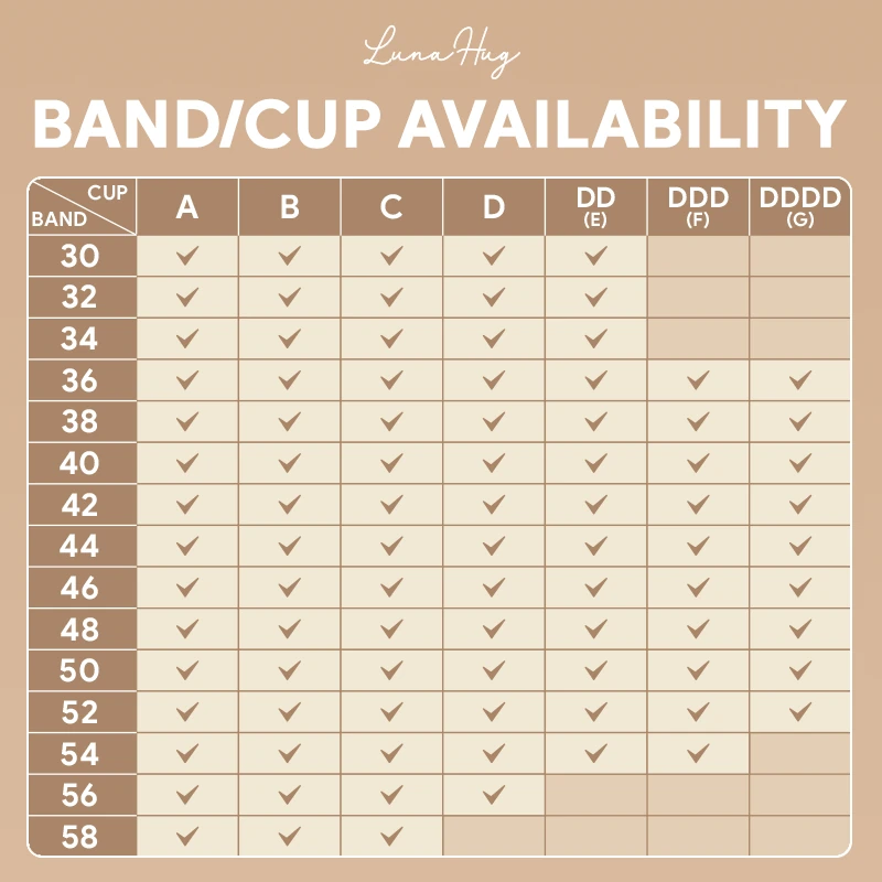 LunaHug bra fits true to size, offering a comfortable and supportive fit. We recommend you select your regular size.
